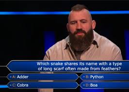 The charity edition of the show had Joe aiming to win money for CALM, the Campaign Against Living Miserably. Host Jeremy Clarkson guided him through the opening questions, but by the time Joe reached the £500 mark, things got complicated. The question seemed simple on paper: “Which snake shares its name with a type of long scarf often made from feathers?” The options were Adder, Python, Cobra, and Boa.